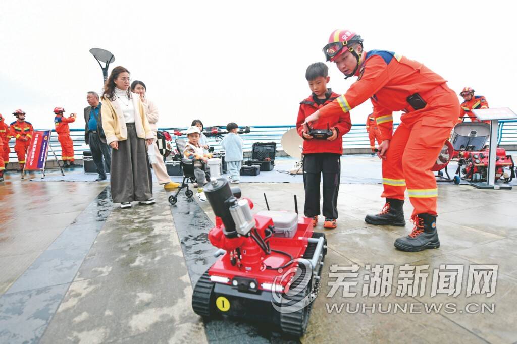 此外,一系列最先進的消防救援器材設施向市民展示,包括地面跑的、火里鉆的、水里游的、天上飛的等。許多市民在消防員指導下感受這些智能化高端消防器材設施后連呼大開眼界。這些先進設備在有效開展滅火救援、保護人民群眾生命財產安全、避免救援人員在危急情況下受困遇險等方面發揮了積極作用,這也是蕪湖消防提升新質救援力,發展高質量消防救援工作的創新體現。