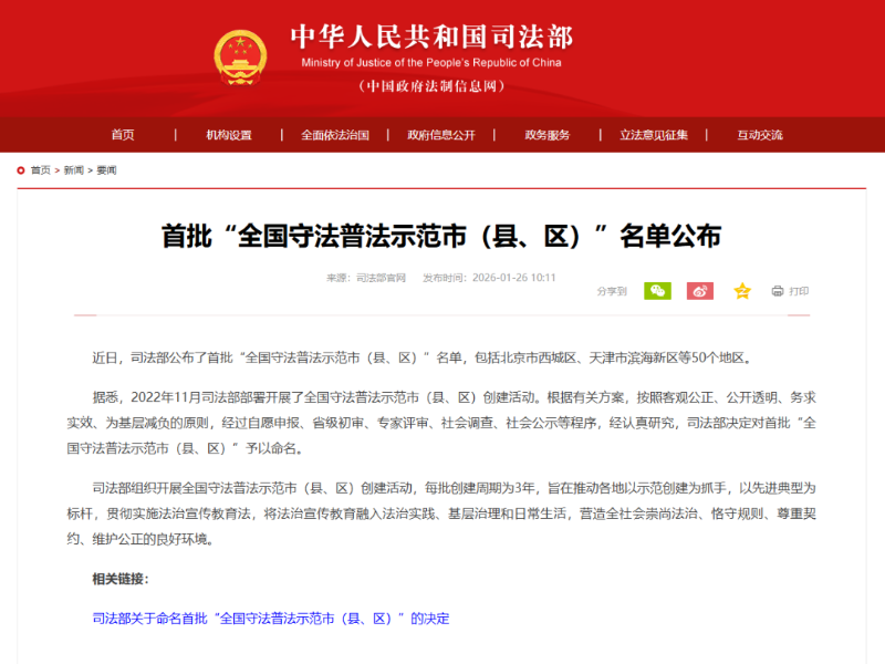 首批“全國守法普法示范市(縣、區)”名單
